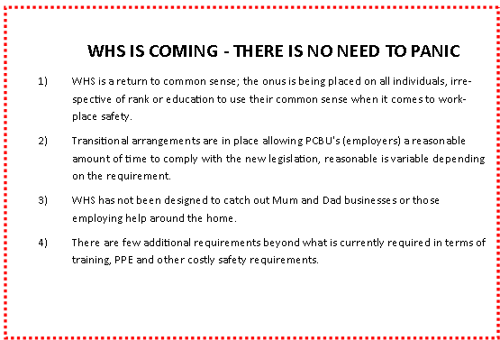 To ensure your business is on track to meeting the new legislation next year, the best place to start is right here with this article > WHS how can I be ready? It is a no nonsense guide to preparing your business for the changes that are coming.